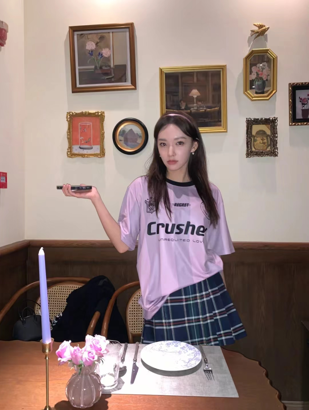 实力爱豆程潇身穿SLY粉紫色字母球衣搭配格纹半裙与好友们聚会,整体低明度的穿搭配色,粉紫与深蓝碰撞,复古俏皮感融合运动风与少女的甜酷感。混搭的blockcore在复古氛围感餐厅中别具一番特色。
