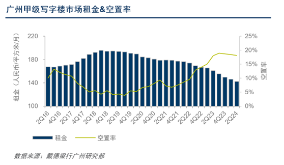 戴德梁行的数据显示,今年第二季度,广州甲级写字楼租金降至2016年以来的最低,录得每月每平方米142.5元;空置率虽环比2023年微降,但仍处于历史较高水平,截至二季度空置率录得 18.1%。
