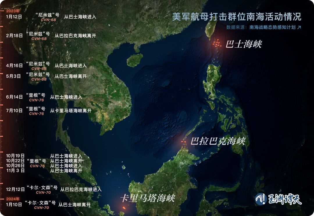 今年3月,“南海战略态势感知计划”发布了《2023年美军南海军事活动不完全报告》,报告统计了2023年美国航母打击群位南海活动情况。