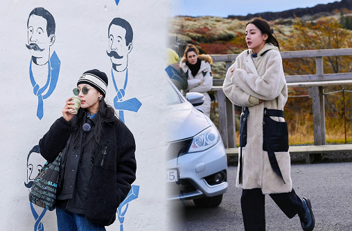 在花少中热巴这一套Martin Kim摇粒绒拉链外套搭配一条复古蓝直筒牛仔裤,穿搭保暖且时髦,加分小单品必须是Maje Franch的英文印花帆布包,保暖时尚还不显臃肿的外套谁不爱呢?另一款LOW CLASSIC设计师女款大衣也是陪伴热巴在冰岛游玩的一件保暖时尚装备,直筒型的设计弱化了毛绒的臃肿感,搭配黑色直筒裤,整体时尚满分。