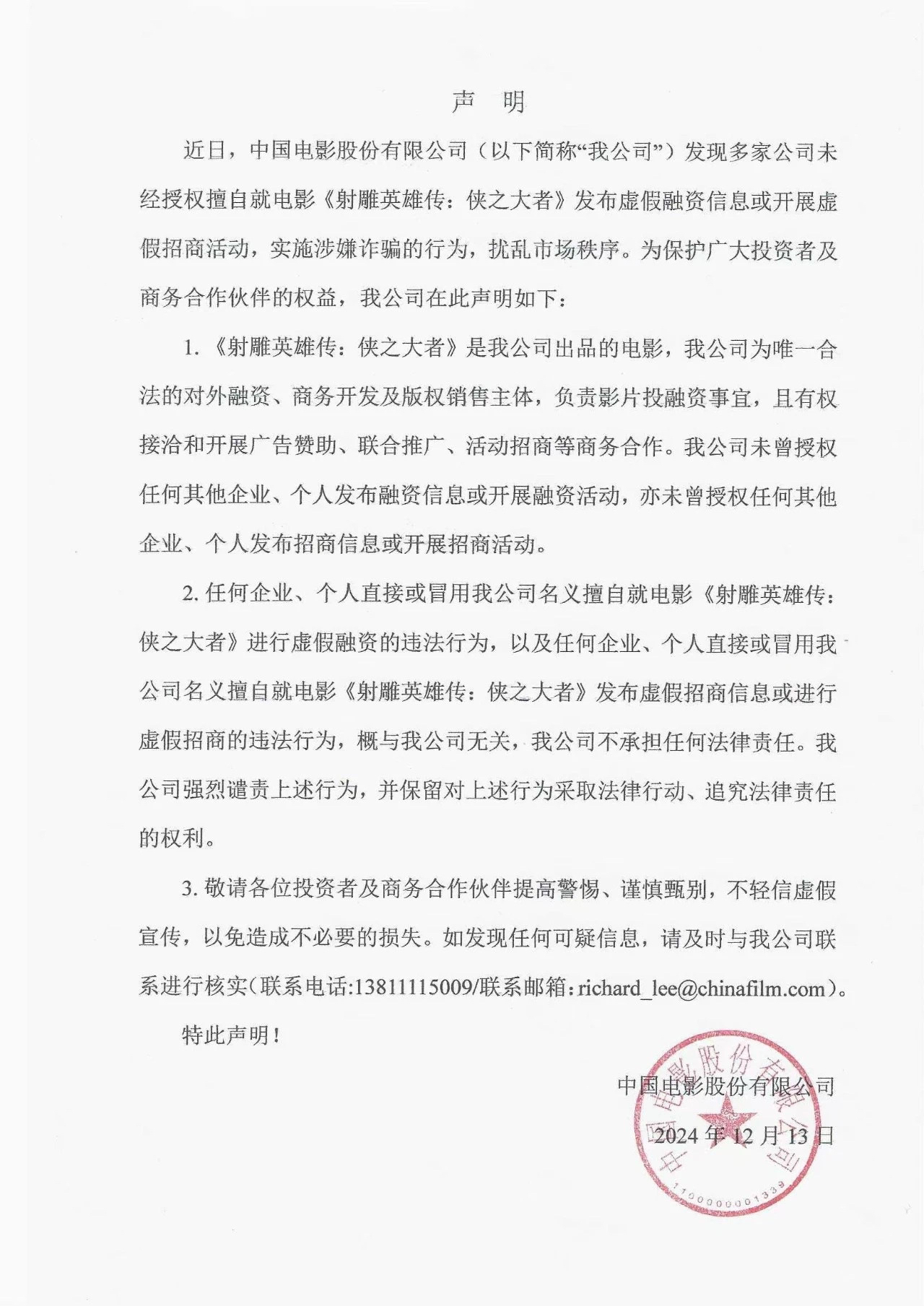 “中国电影”在声明中称,近日,公司发现多家公司未经授权擅自就电影《射雕英雄传:侠之大者》发布虚假融资信息或开展虚假招商活动,实施涉嫌诈骗的行为,扰乱市场秩序。《射雕英雄传:侠之大者》是公司出品的电影,公司为唯一合法的对外融资、商务开发及版权销售主体,负责影片投融资事宜,且有权接洽和开展广告赞助、联合推广、活动招商等商务合作。公司未曾授权任何其他企业、个人发布融资信息或开展融资活动,亦未曾授权任何其他企业、个人发布招商信息或开展招商活动。