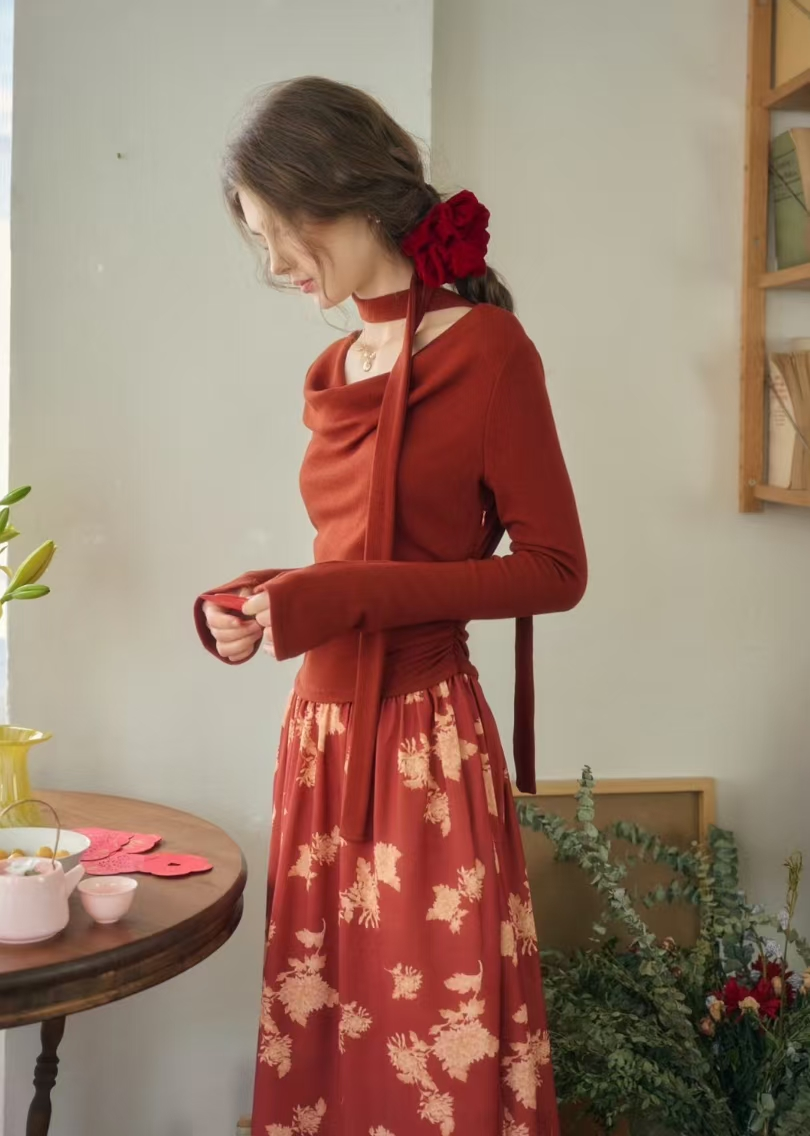 新年红玫瑰的温柔感当然不能少了红色毛衣裙,拼接款红色毛衣裙,红色的温柔感中融入一点白色,颜色搭配亮眼,让这一套温柔感的穿搭更加不挑人。