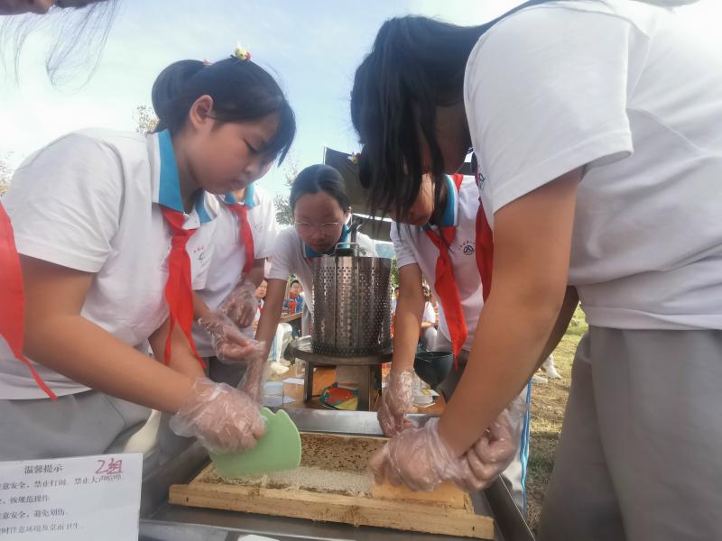 活动现场还公开展示了部分特色课程。在国农港供销村播产业园“AI赋能·小小主持人”区域,来自平谷区大兴庄中心小学的学生们正在模拟直播带货。一旁,来自紫兴园(北京)食品科技有限公司的食品工程师正在向平谷八小的学生讲述发酵知识,“今天我们学了酸奶的制作过程,知道了它为什么好吃的关键,特别有趣!”来自平谷八小的周以漠说。活动现场还设有传统非遗课程——冰糖葫芦制作、探秘植保无人机教学计划、21天生命奇迹——揭秘鸡胚孵化的“时光密码”、桃园飘香、甜蜜丰收节——趣味体验蜂蜜古法压榨、天宫探秘、金海扬帆、杏绘南山等10节观摩课,集中展示了平谷区劳动教育课程的丰硕成果。