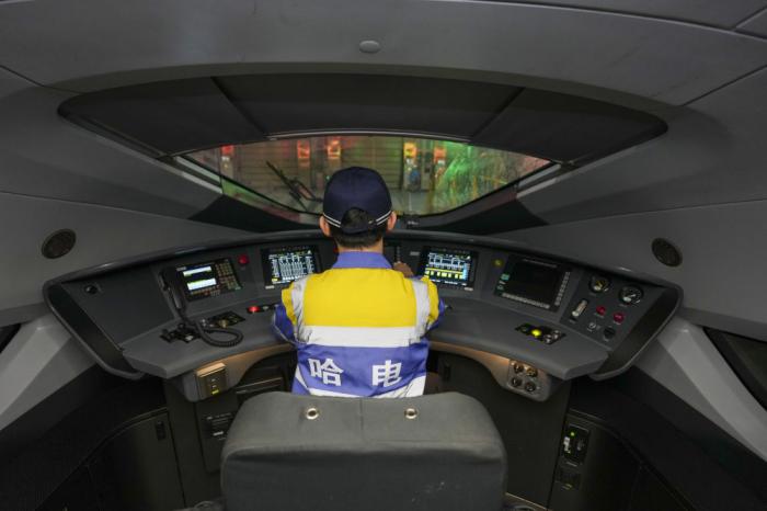 在中国铁路哈尔滨局集团有限公司哈尔滨动车段检修库,电务段信号工人在驾驶室内对动车组ATP列车超速自动防护系统进行检测作业,观察显示设备对速度和制动命令的响应情况。