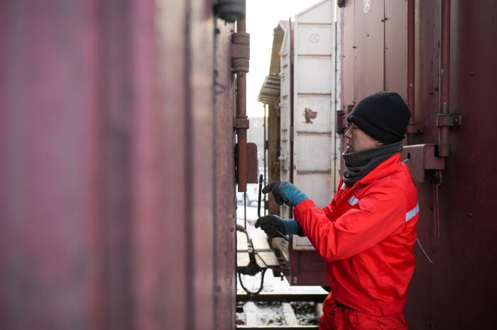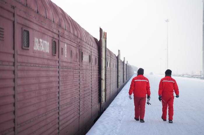 1月31日,在新疆乌鲁木齐中铁特货乌鲁木齐分公司三坪物流基地,工作人员关闭列车车厢。