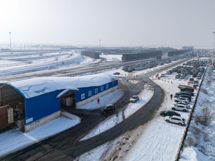 这是1月31日在新疆乌鲁木齐拍摄的中铁特货乌鲁木齐分公司三坪物流基地国铁汽车托运交车区。