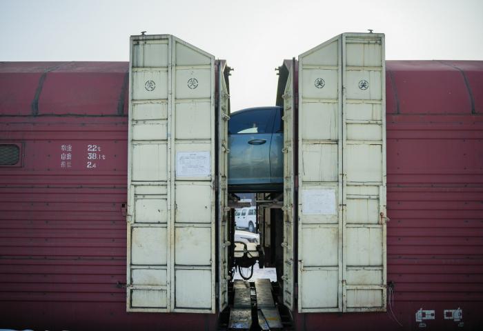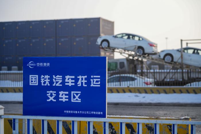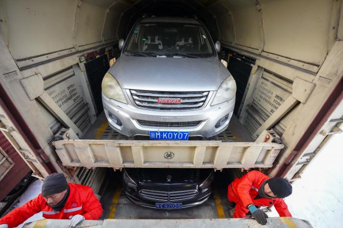 近年来,为了满足人们日益多元化的用车需求,中铁特货物流股份有限公司在铁路12306平台推出了“汽车托运”业务,开通多条热门托运专线。1月31日,在新疆乌鲁木齐中铁特货乌鲁木齐分公司三坪物流基地,工作人员驾驶待托运车辆在列车中行驶。