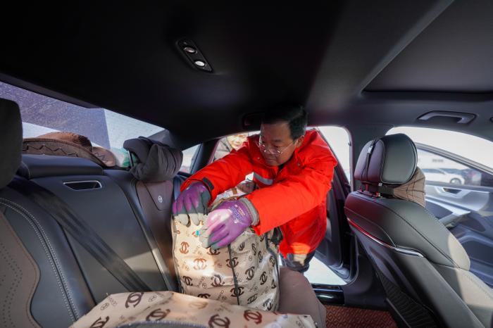 1月31日,在新疆乌鲁木齐中铁特货乌鲁木齐分公司三坪物流基地,工作人员对待托运车辆内的行李进行安检。