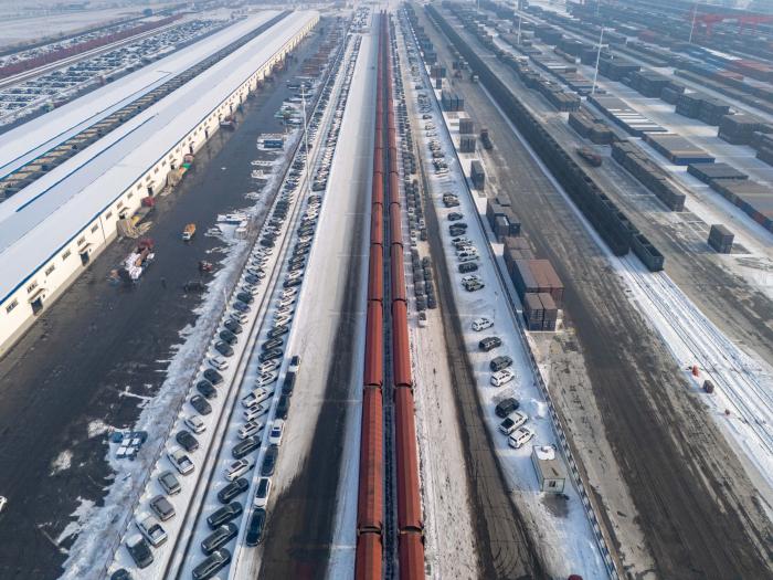 1月31日,在新疆乌鲁木齐中铁特货乌鲁木齐分公司三坪物流基地,工作人员驾驶待托运车辆驶入列车(无人机照片)。