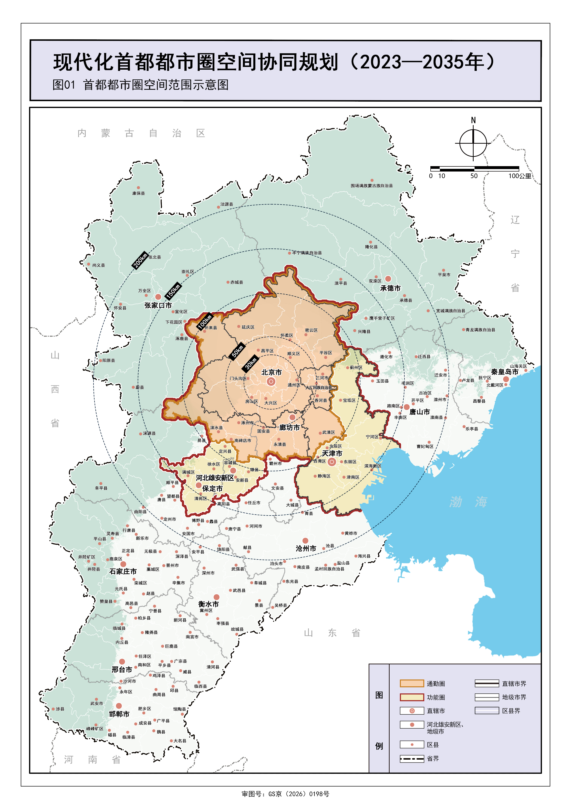 功能圈强调疏解提升,是首都都市圈发展的核心区域和实体空间,主要包括北京市,天津市,河北雄安新区,河北省廊坊市广阳区、安次区、三河市、大厂回族自治县、香河县、固安县、永清县,保定市竞秀区、莲池区、徐水区、满城区、清苑区、涿州市、涞水县、高碑店市、定兴县,张家口市怀来县,面积约4.2万平方公里。
