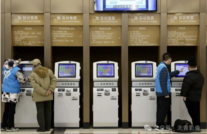 志愿者在售票厅自动售票机前服务旅客