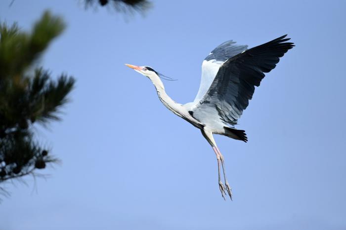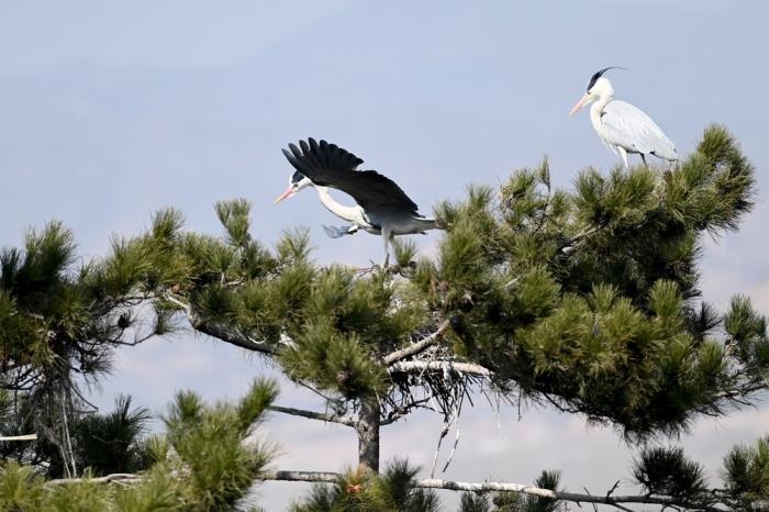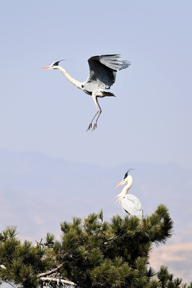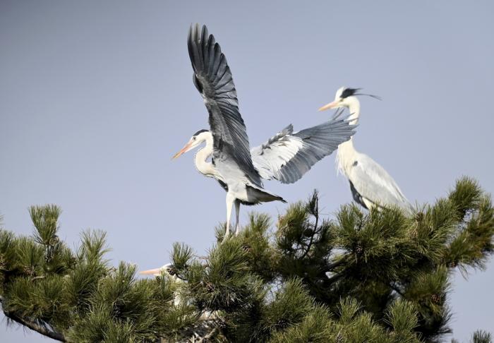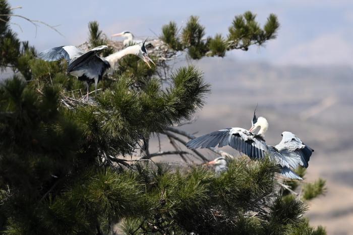 3月11日,在山西省吕梁市方山县积翠乡,苍鹭在林间嬉戏。