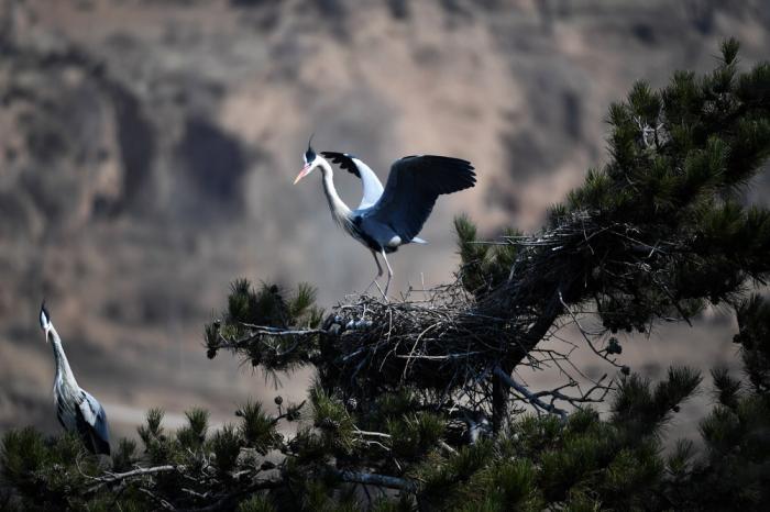 3月11日,在山西省吕梁市方山县积翠乡,苍鹭在林间栖息。春日,在位于吕梁山深处的山西省吕梁市方山县积翠乡,大批迁徙而来的苍鹭在此安家筑巢,惬意栖居。