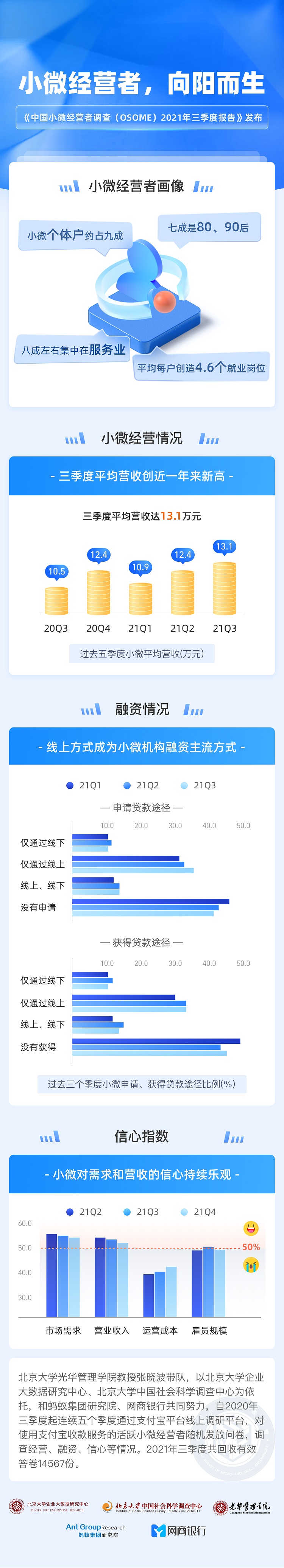 近日,北京大学光华管理学院张晓波教授研究团队在蚂蚁集团研究院和网商银行的协助下,调研并发布了《中国小微经营者调查2021年三季度报告》,报告显示,2021年第3季度,小微经营者平均季度营收达13.1万元,创下近一年来新高,同时信心指数平稳回升,连续3个季度保持在乐观区间,显示出较强的经济韧性。