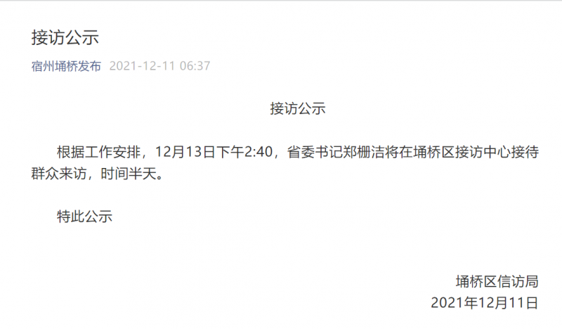 12月11日,安徽省宿州市埇桥区信访局通过“宿州埇桥发布”微信公众号发布一则《接访公示》:根据工作安排,12月13日下午2:40,省委书记郑栅洁将在埇桥区接访中心接待群众来访,时间半天。