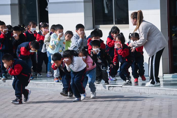 11月8日,东林小学的学生们在老师的带领下进行火灾疏散逃生演练。