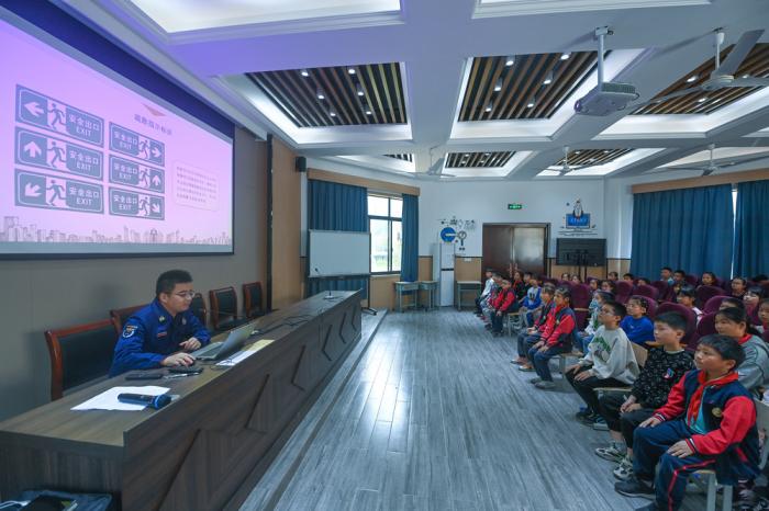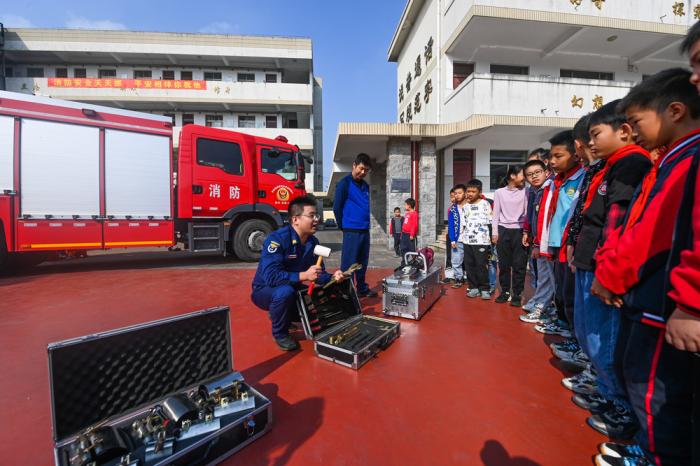 11月8日,东林镇消防队员在给东林小学的学生们普及消防安全知识。 消防队员结合典型火灾事故,详细讲解了火灾的危害性,传授火场如何逃生等消防基础常识,并实地演示了灭火器及各类消防器材操作使用方法。