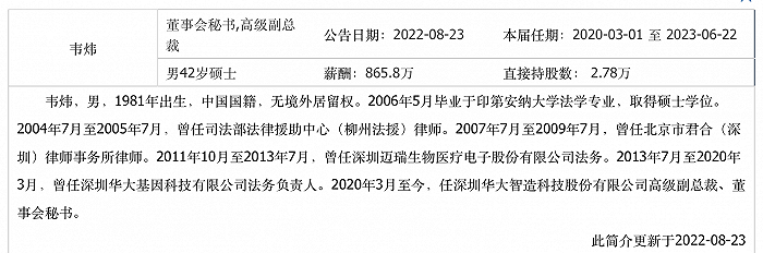 来源:同花顺资料显示,韦炜1981年生,2006年5月毕业于印第安纳大学法学专业,取得硕士学位。2004年7月至2005年7月,曾任司法部法律援助中心(柳州法援)律师。2007年7月至2009年7月,曾任北京市君合(深圳)律师事务所律师。2011年10月至2013年7月,曾任深圳迈瑞生物医疗电子股份有限公司法务。2013年7月至2020年3月,曾任深圳华大基因科技有限公司法务负责人。需要指出的是,上述薪酬都未涉及各位高管的持股收益。收益与风险同在有高收益,同时也会伴随着高风险。随着注册制时代来临,随着监管趋严,高管的工作繁杂且需规范,一旦踏过红线,处罚力度惊人。5月13日*ST中昌(600242.SH)披露的《行政处罚事先告知书》显示,公司未按规定披露关联交易、未及时披露重大诉讼及进展情况,其中,公司时任董事、副总经理和财务总监薛玮佳,被给予警告,并处以了50万元的罚款。5月11日的ST起步(603557.SH)公告显示,因公司2018年、2019年年度报告及2020年半年度报告存在虚假记载、重大遗漏,公司公开发行文件编造重大虚假内容,最终上市公司被责令改正,给予警告,并处以5700万元罚款;时任董事长章利民被给予警告,并处以500万元罚款;时任财务总监陈章旺被给予警告,并处以300万元罚款;时任总经理周建永被给予警告,并处以1000万元罚款;时任董事会秘书、董事、副总经理吴剑军被给予警告,并处以200万元罚款。另外,监管层还对周建永采取10年市场禁入措施,对章利民、陈章旺采取5年证券市场禁入措施。进一步看ST起步的公告,周建永是组织、指使造假者,章利民是直接负责的主管人员,陈章旺是直接参与造假,而时任董秘吴剑军“负责组织和协调公司信息披露事务,在上述发行文件中签字确认,是其他责任人员。” 即便如此,200万的罚款对其也不是小数目。根据2020年年报,吴剑军的年薪为34.62万元。