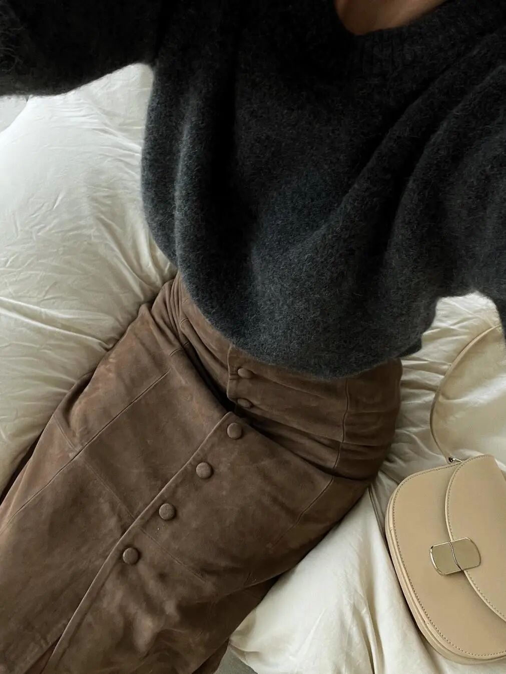 也可以像博主Valeria 这般,做年轻活力的美拉德女孩。一条小A版的暖棕色羊绒裙,减少了对双腿的束缚,而橘色的针织为整身增添了明媚气息,羊绒裙也不那么显成熟了。