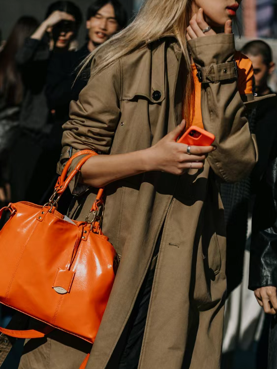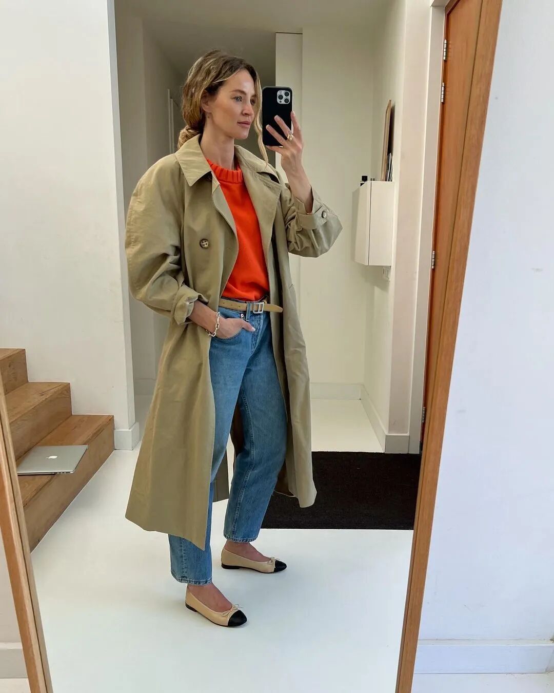 Anouk Yve另外一套风衣搭配里面穿的是橘色毛衣,换了穿法,橘色的小面积点缀效果仍是一样的。
