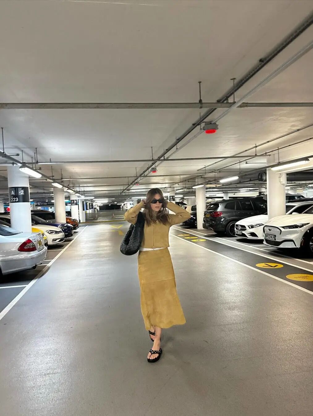 另外,还有麂皮,自带做旧质感,光泽暗哑低调,博主Camille Charriere穿着的麂皮套装,流畅的剪裁透露着不菲的价格,很有老钱的腔调。