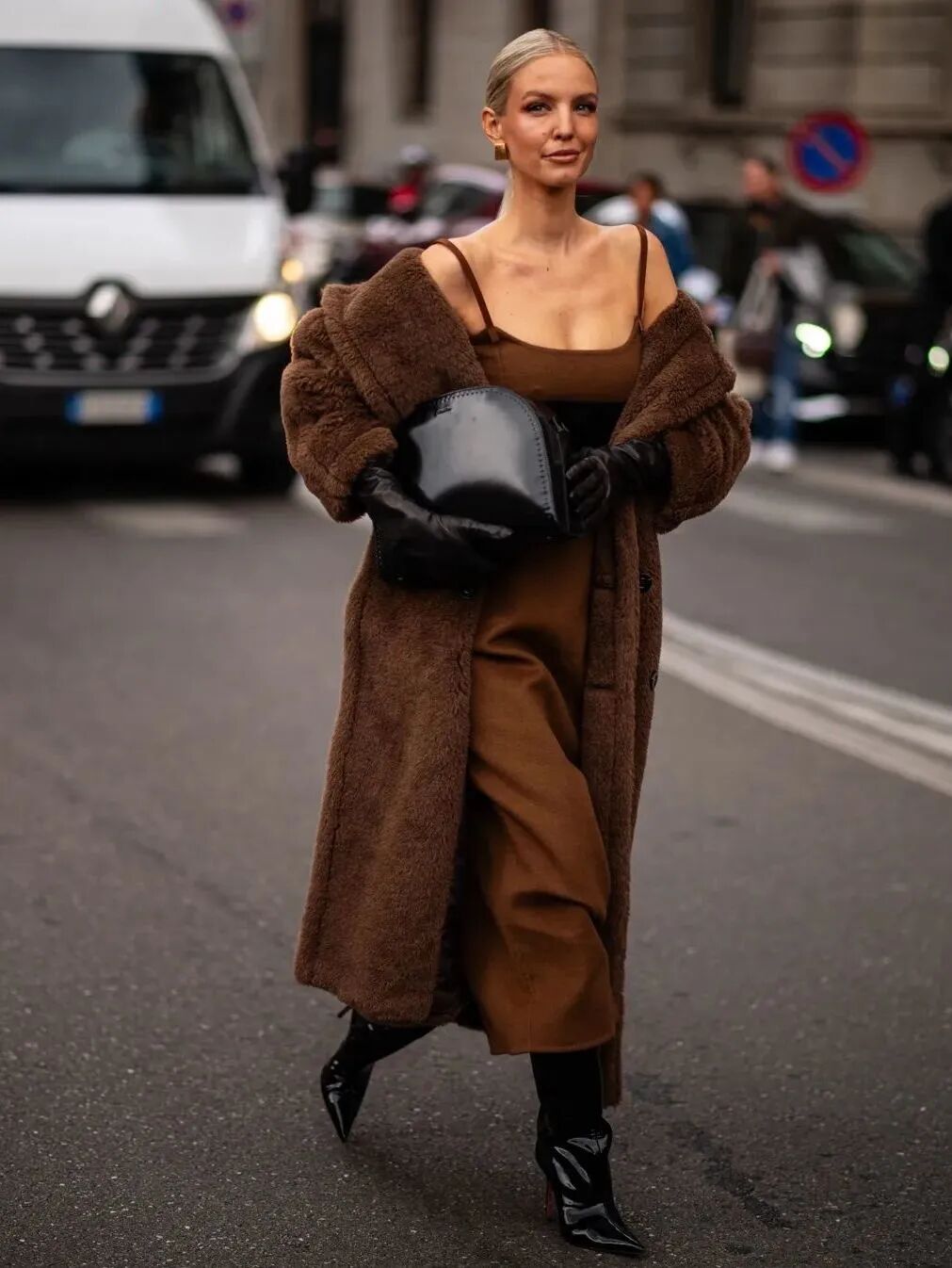 丝滑融入到棕色调的ootd中,视觉舒适度极佳。同样的色调同步过渡到乐福鞋、长靴上,可以解锁美拉德配色下更为丰富的风格。