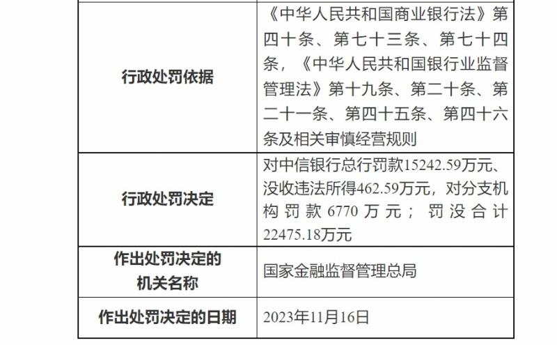 涉56项违规行为 中信银行被国家金融监管总局罚没超2.24亿元