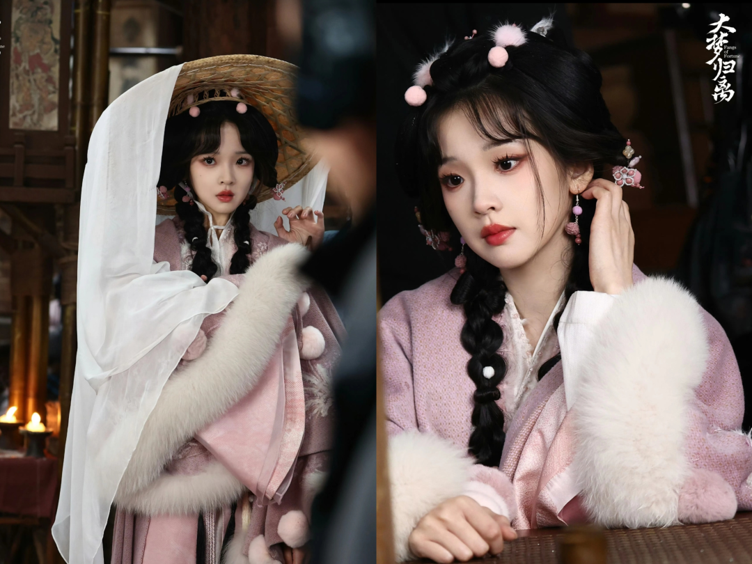 张淼怡在《大梦归离》里面饰演“讹兽”,相比前段时间广为诟病的林黛玉,此次妆造大受好评,“讹兽”被设定为呆萌可爱的撒谎“兔子精”,发型用大发包与长辫子修饰脸型,并点缀粉色毛绒球来突出“兔子精”的特点,衬托得更加娇俏可爱,脸部妆容色彩浓烈,更加符合妖的特性。服装上以粉紫色调为主,袖口采用大毛领和毛球装饰,一以贯之展现“兔子精”形象,整体的设计虽然有不少毛绒元素,却显得轻快灵动,符合角色活泼特性。
