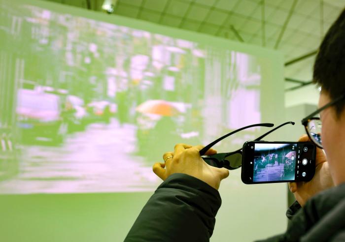 观众只要戴上设备眼镜,空间魔盒的效果即可显现,平面的摄影作品瞬间变成了人物可以跃出的画面,有场景纵深环绕的3D场景,人物笑容浮现、旅行风景重生,真实得几乎可触碰。