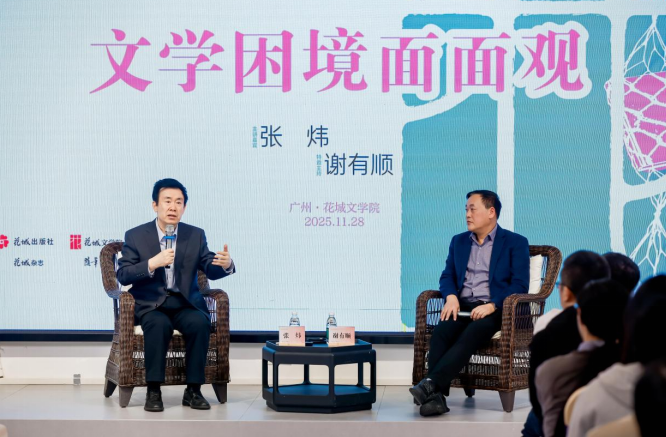 近日,“花城文学课”第24讲邀请到了茅盾文学奖获奖作家,中国作家协会副主席张炜与中山大学文学院教授,广东省作家协会主席谢有顺。两位老师就“文学困境面面观”这一主题进行了深入的对话与分享。此次讲座在《花城》杂志官方视频号“花城文学课”独家直播,在线观看人数超过12万。