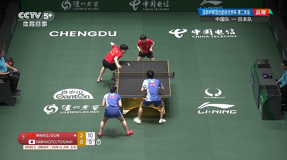 最后一场女双比赛,蒯曼/王曼昱1-0战胜张本美和/大藤沙月,比分为:11-9。最终,中国队大比分8-5击败日本队。