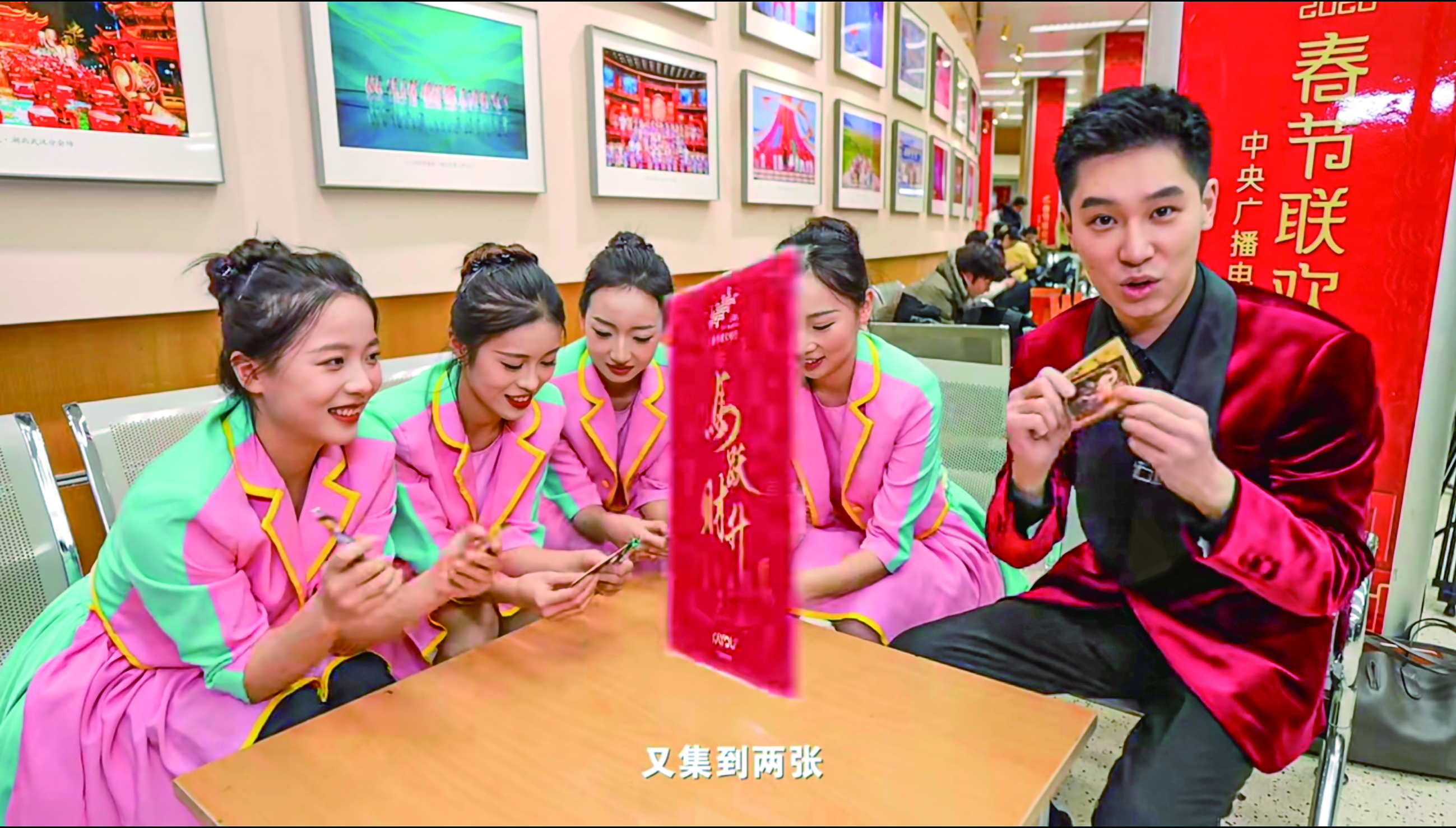 在总台春晚后台,主持人宋宇豪(右一)领取集卡任务。受访者供图