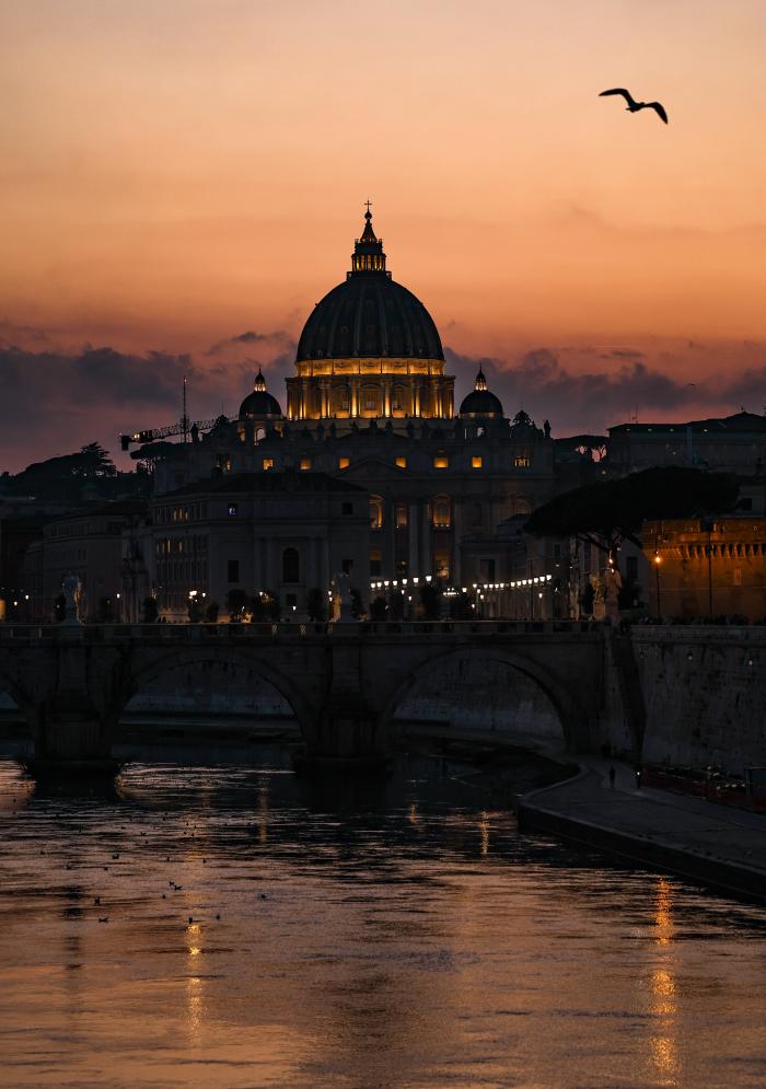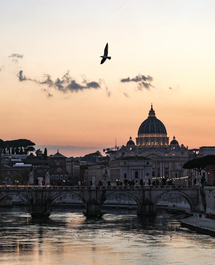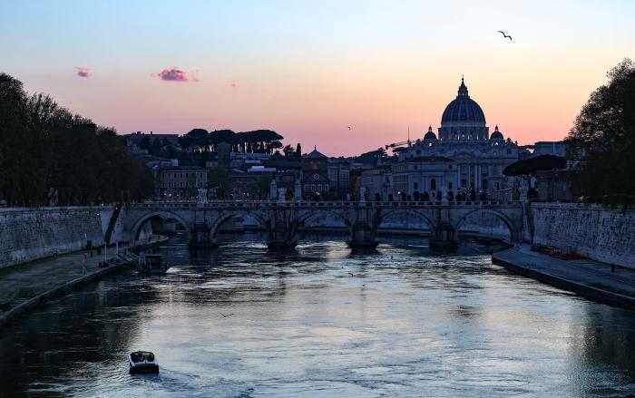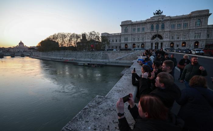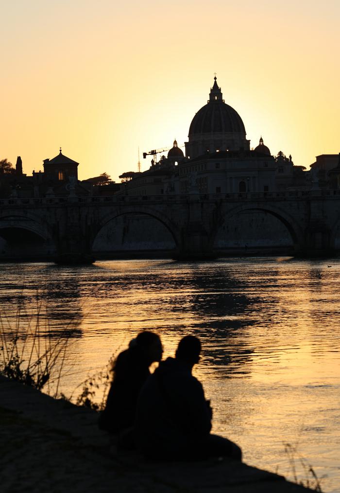 3月25日黄昏时分,人们在意大利首都罗马的台伯河畔拍照。