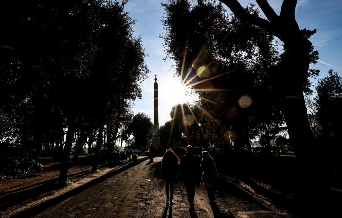 3月25日,人们走向意大利首都罗马的人民广场观看日落。
