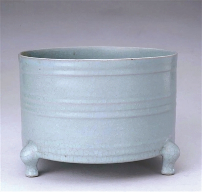 北宋汝窑 淡天青釉弦纹三足樽式炉