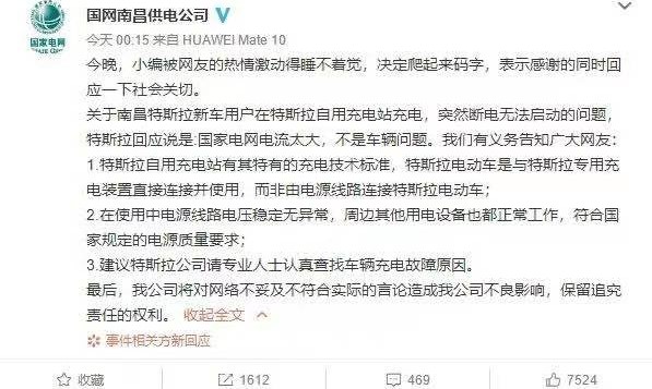针对南昌特斯拉新车用户在特斯拉自用充电站充电,是因国网电流过大导致突然断电无法启动言论,国网南昌供电公司发布声明称,特斯拉自用充电站有其特有的充电技术标准,特斯拉电动车与特斯拉专用充电装置直接连接并使用,并非由电源线路连接特斯拉电动车;而在使用中电源线路电压稳定无异常,周边其他用电设备也都正常工作,符合国家规定的电源质量要求;建议特斯拉公司请专业人士认真查找车辆充电故障原因。