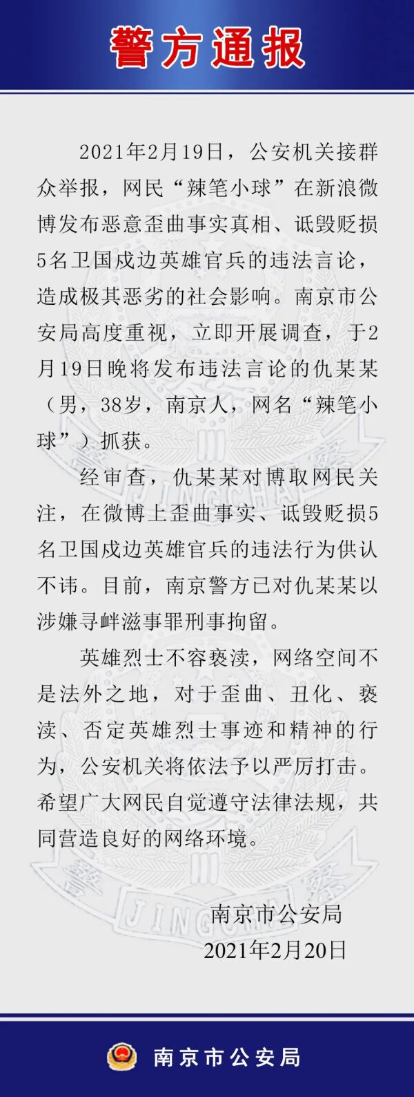 2月19日,公安机关接群众举报,网民“辣笔小球”在新浪微博发布恶意歪曲事实真相、诋毁贬损5名卫国戍边英雄官兵的违法言论,造成极其恶劣的社会影响。南京市公安局高度重视,立即开展调查,于2月19日晚将发布违法言论的仇某某(男,38岁,南京人,网名“辣笔小球”)抓获。