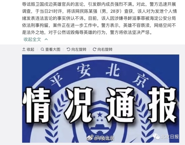 2月20日,有群众向公安机关举报,有网民在微信群中发布多条侮辱诋毁卫国戍边英雄官兵的言论,引发群内成员强烈不满。对此,警方迅速开展调查,于当日21时许,将该网民陈某强(男,28岁)查获,该人对为发泄个人情绪发表违法言论的事实供认不讳。目前,该人因涉嫌寻衅滋事罪被海淀公安分局依法刑事拘留,案件正在进一步工作中。