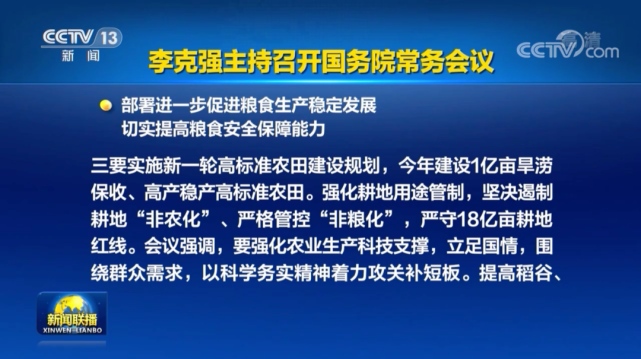 会议提到,要实施新一轮高标准农田建设规划,今年建设1亿亩旱涝保收、高产稳产高标准农田。