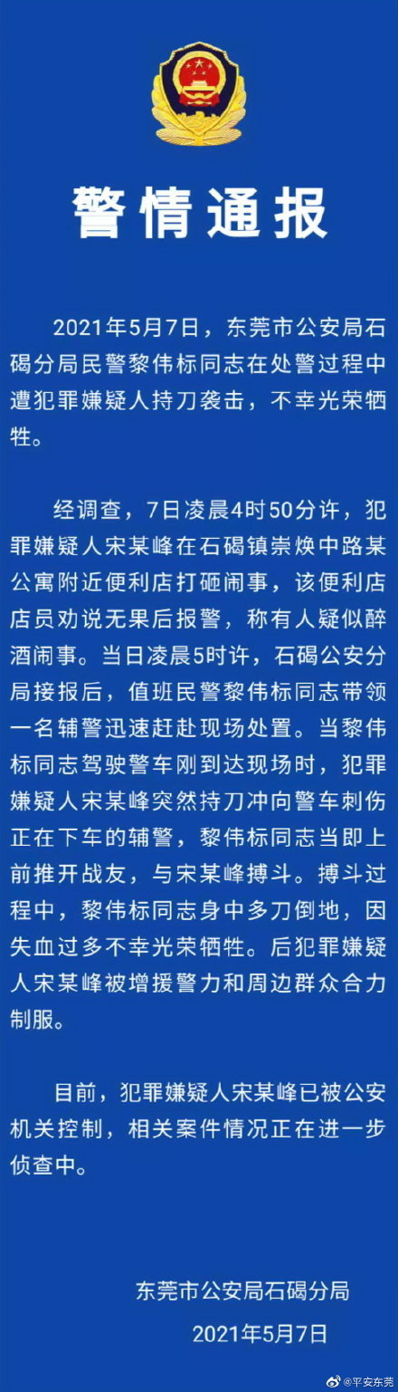 @平安东莞 微博通报称,5月7日,东莞市公安局石碣分局民警黎伟标同志在处警过程中遭犯罪嫌疑人持刀袭击,不幸光荣牺牲。