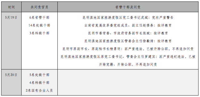 5月19日,云南省纪委省监委通报“昆明滇池国家旅游度假区铭真高尔夫球场整改不力问题追责问责情况”;5月20日,通报了“西双版纳州景洪市生活垃圾处理场问题追责问责情况”。