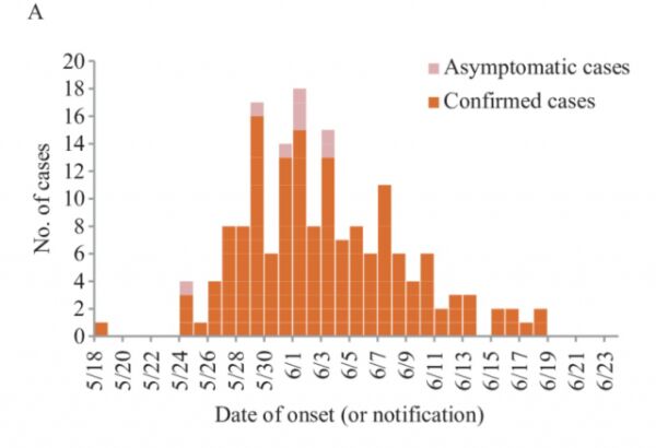 广东5月、6月167例新冠病例的流行图标,横坐标为发病或通报时间,纵坐标为病例数。深橘图例确诊病例,浅橘图例为无症状感染者 本文图片均来自文章截图