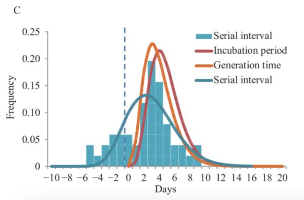 图例从上到下为,系列间隔柱状图,潜伏期、代际间隔、系列间隔的估计分布曲线