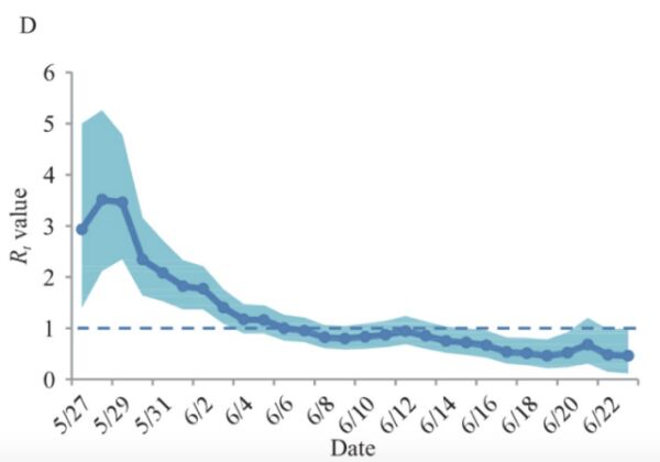 研究者又进一步估计截至6月23日的有效再生数(Rt),Rt是衡量干预前后传播情况的指标。从5月27日至5月29日,Rt由3.0增加到了3.5,然后从5月30日起减小,在6月6日达到1。在6月7日至15日间,Rt值在1附近波动。从6月16日起,Rt值开始小于1。如图3所示,蓝色虚线表示Rt =1,虚线下的部分表示,只要干预措施持续,病毒持续传播的可能性不大,这说明疫情已经得到控制。6月19日至23日,再无新增病例报告。