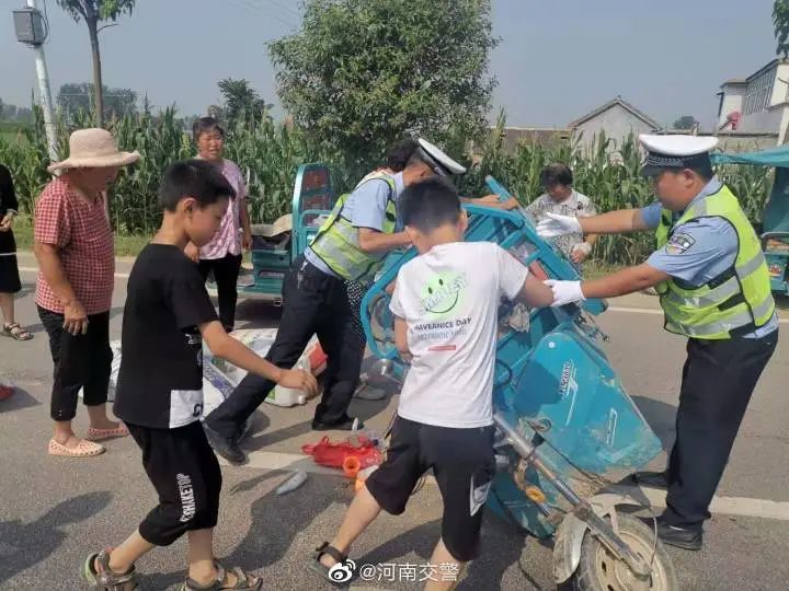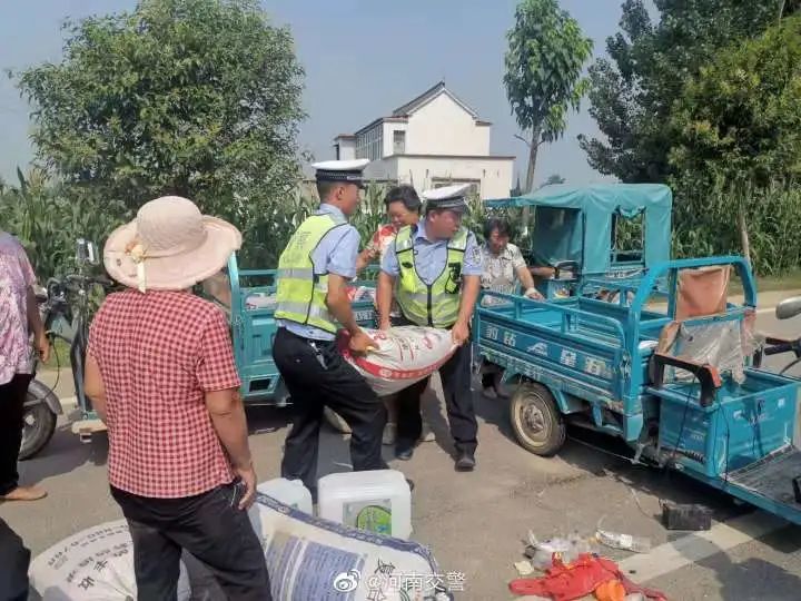 2021年06月30日上午10时左右,周口太康县交警大队七中队中队长刘峰带领队员在太康县高贤乡水东革命老区执勤时,见一老年妇女站在一辆翻倒的三轮车旁,一脸焦急的望着散落一地十余袋麦子束手无策。