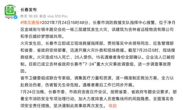 就在前一天(7月24日),长春市位于净月区金城街与银丰路交会处一栋三层建筑发生火灾,造成15人死亡、25人受伤。