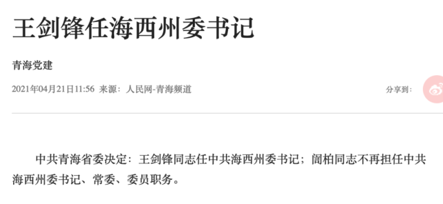 今年4月,中共青海省委决定:王剑锋任中共海西州委书记;訚柏不再担任中共海西州委书记、常委、委员职务。