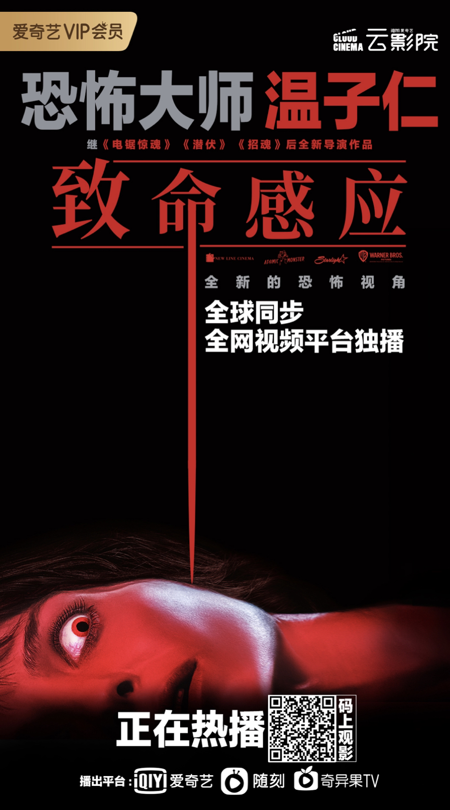 9月10日,“恐怖大师”温子仁最新力作《致命感应》正式上线爱奇艺“云影院”,实现中国大陆地区和北美院线、HBO MAX同步播出。这意味着国内喜爱温氏恐怖风格的影迷第一时间即可在线畅享温子仁回归恐怖题材的全新力作。该片定价12元,爱奇艺VIP会员享半价权益。