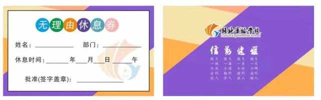 周雨介绍,“无理由休息券”设计成一张卡片,正面印有骆驼实验学校“信勤健雅”的校训,背面印有“无理由休息券”,下面则是姓名、部门、请假时间等信息。每张“无理由休息券”可以在工作日休息半天,老师们自己选择上午休息还是下午休息。根据初中和小学的不同情况,骆驼实验学校给初中老师每个月发2张券,小学老师发1张券。