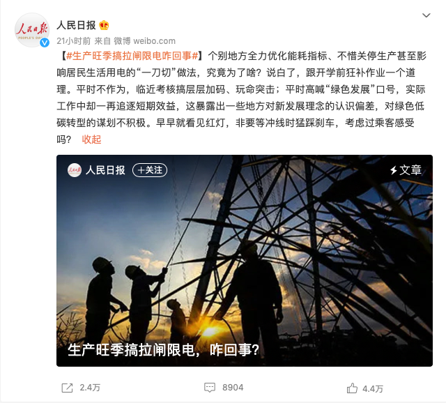 9月26日,《人民日报》微博曾刊发文章称,个别地方全力优化能耗指标、不惜关停生产甚至影响居民生活用电的“一刀切”做法,究竟为了啥?说白了,跟开学前狂补作业一个道理。